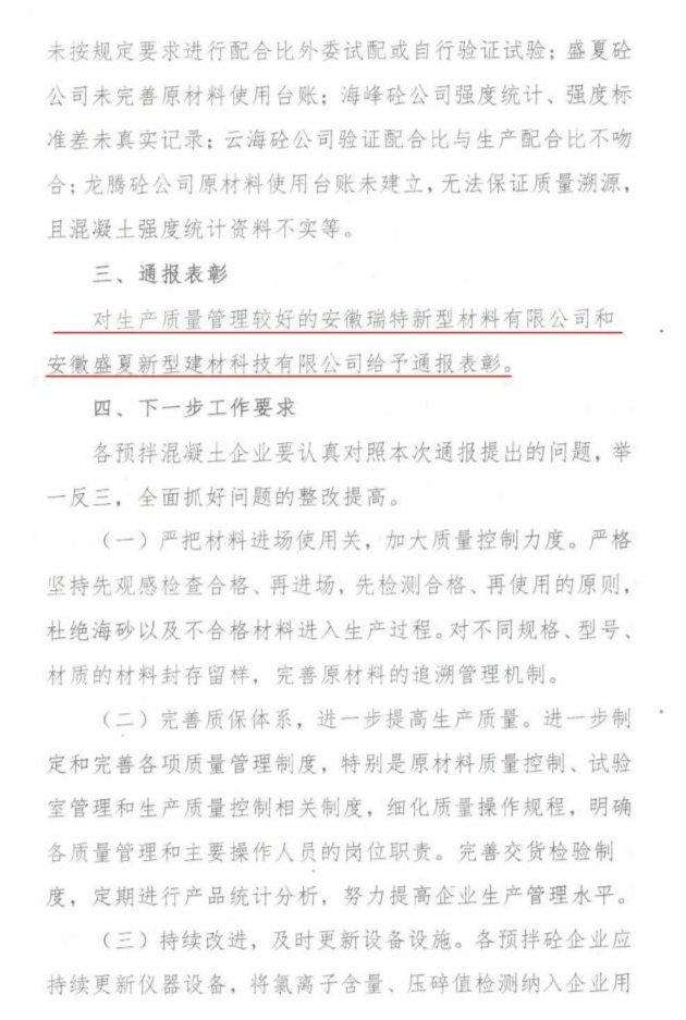 8月10日,廬江縣住建局發布了關于廬江縣2021年第二季度預拌混凝土企業生產質量專項檢查情況的通報文件,安徽瑞特以優秀的生產質量管理水平得到了廬江縣住建局的通報表彰。