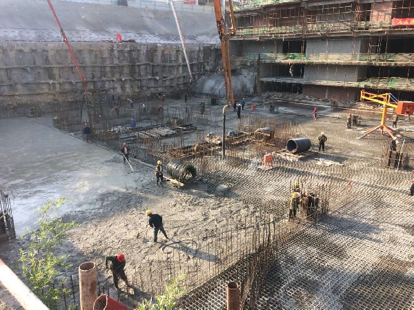 在清脆且規(guī)律的泵送聲伴奏下,一方又一方混凝土按照項(xiàng)目的要求注入指定區(qū)域,蚌埠建材主要領(lǐng)導(dǎo)深入澆筑一線,實(shí)地指導(dǎo)澆筑工作,并慰問所有生產(chǎn)參與人員;質(zhì)量管理人員也按照預(yù)定澆筑方案對各種原材料實(shí)施定期檢測,并對不同時(shí)段的入場混凝土進(jìn)行測溫記錄工作;隨著統(tǒng)計(jì)數(shù)據(jù)顯示1000 m3、2000 m3……的持續(xù)攀升,器材部門加強(qiáng)原材料調(diào)配力度,組織各種原材料有序進(jìn)場,以保證生產(chǎn)平穩(wěn)推進(jìn);設(shè)備管理人員多頻次檢查設(shè)備運(yùn)行狀況,確保設(shè)備運(yùn)行正常。在總方量澆筑過半以后,生產(chǎn)人員結(jié)合現(xiàn)場實(shí)際情況,與項(xiàng)目管理人員充分溝通,針對現(xiàn)場道路的客觀因素,將第四臺備用泵送設(shè)備及時(shí)調(diào)配到位,干脆利索的完成一次時(shí)間差,確保近三千平方澆筑面積全覆蓋,避免出現(xiàn)冷縫這一惡性質(zhì)量事故的發(fā)生,此項(xiàng)舉措獲得了項(xiàng)目的高度評價(jià),4月28當(dāng)天也創(chuàng)下了單日4488 m3的歷史最高澆筑記錄。