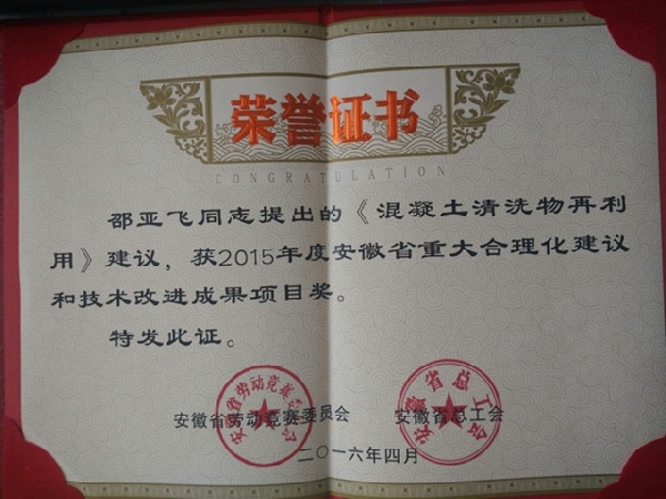 《混凝土清洗物再利用》榮獲“2015年度安徽省重大合理化建議和技術(shù)改進(jìn)成果項(xiàng)目獎(jiǎng)”