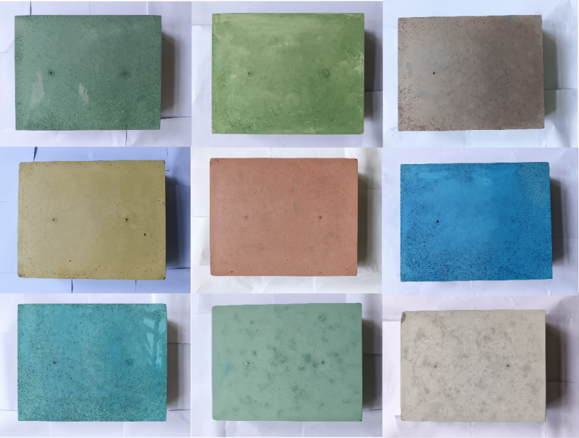 為貫徹落實公司一屆一次職代會會議精神,建材產業研究院積極圍繞新型建筑材料開展相關技術探索,反復的試配攻關,不斷優化調整配合比,進行試驗、檢測、分析、改進,最終調配出多套高耐久、高強、工作性優異,涵蓋牛油果色、白色、天空藍、巧克力色等十余種顏色彩色混凝土配合比。