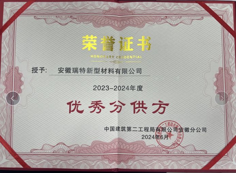 獲得這一榮譽,不僅是對安徽瑞特履約能力的認可,也為雙方未來的深入合作奠定了堅實的基礎(chǔ)。展望未來,安徽瑞特將以此次獲獎為契機,與中建二局建立長期穩(wěn)定、互利共贏的合作關(guān)系,持續(xù)推動公司高質(zhì)量發(fā)展。