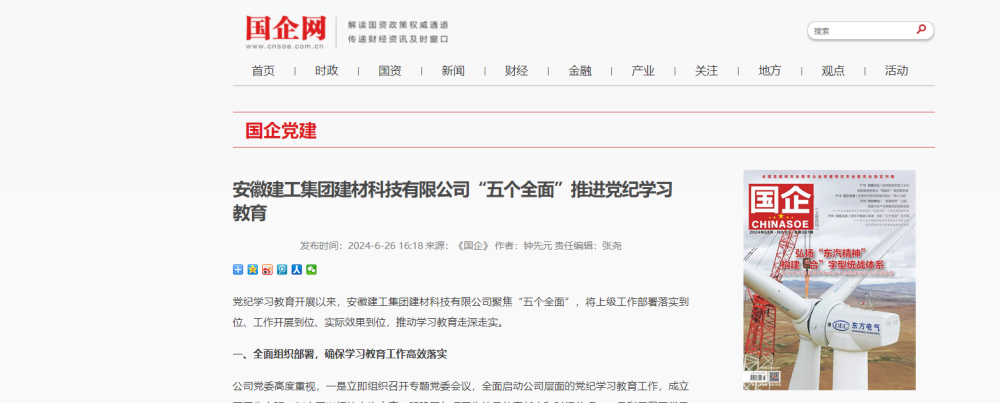 一段時間以來,建工建材兩級黨組織,通過相繼舉辦黨紀學習教育讀書班結業式、專題學習習近平總書記關于全面加強黨的紀律建設的重要論述、講廉潔故事、過政治生日、上專題黨課等多種方式,扎實開展黨紀學習教育工作,激發全體黨員干部學習積極性,推進黨紀學習教育走深走實,相關學習工作情況被國企網黨建頻道轉載。