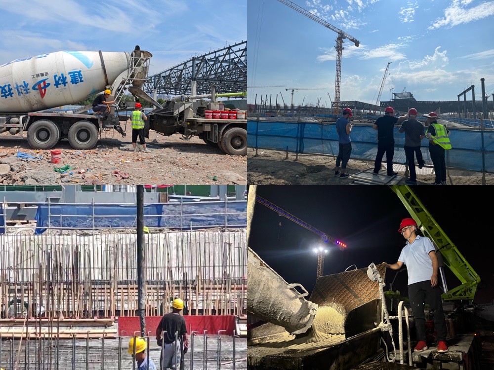 在大眾產業園施工一線,公司駐場保供人員日夜奮戰,克服高溫,忙碌的身影穿梭在施工現場的各個角落。他們的皮膚被太陽曬得通紅,汗水浸透衣衫,“烤”干了,又濕了,再次“烤”干,在全體人員的共同努力下,僅用了20小時,就完成了3822方混凝土澆筑工作,圓滿高效的完成澆筑任務,用行動贏得項目優質好評。