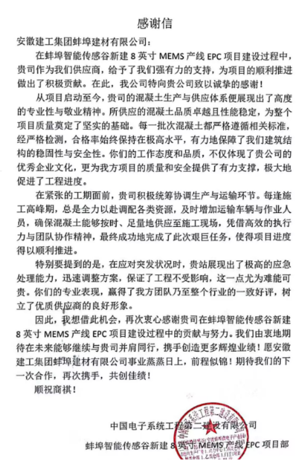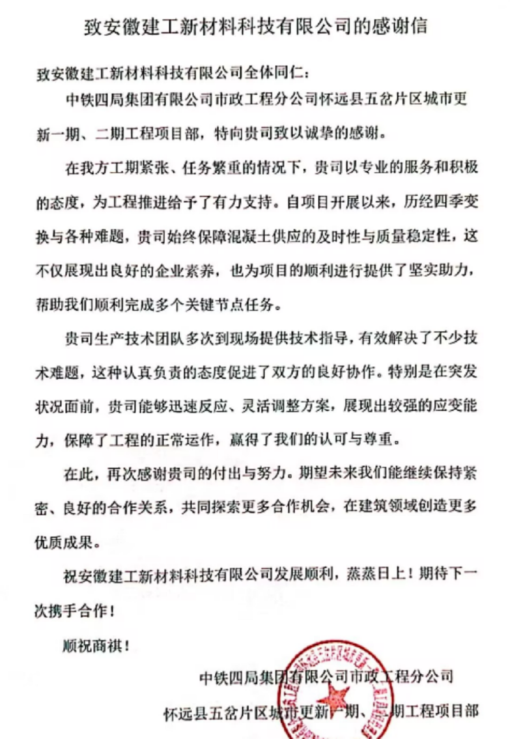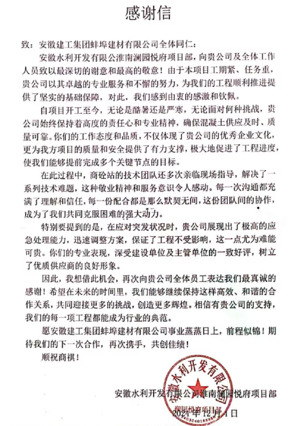 “質(zhì)”得“信”賴(lài)——蚌埠建材近日收獲多封項(xiàng)目感謝信