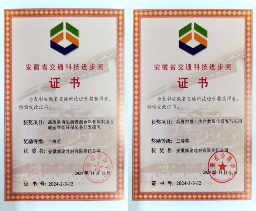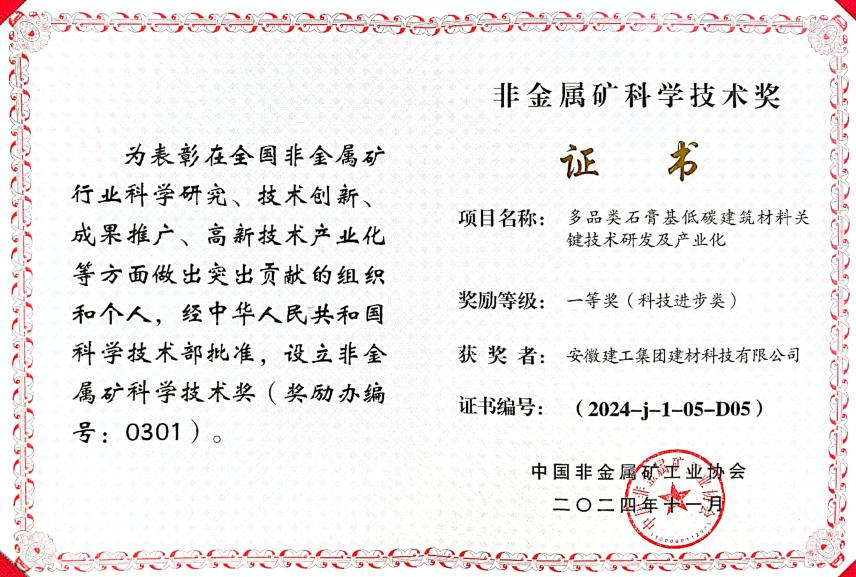 建工建材2024年榮獲多項行業獎項,其中《多品類石膏基低碳建筑材料關鍵技術研發及產業化》榮獲中國非金屬礦科技進步一等獎;《高品質機制砂及高性能混凝土關鍵技術與應用》榮獲安徽省建設科學技術進步一等獎;《高質量再生瀝青混合料骨料制備及成套智能環保裝備開發研究》《瀝青混凝土生產數智化研究與應用》分別榮獲安徽省交通科技進步二、三等獎;《超高摻量RAP溫拌再生技術》《研制瀝青拌合站外加劑投放的報警裝置》榮獲安徽省工程建設QC小組成果大賽一等成果,《提高井周路面接縫平整度一次驗收合格率》《提高市政路面排水通暢一次驗收合格率》榮獲安徽省工程建設QC小組成果大賽三等成果。