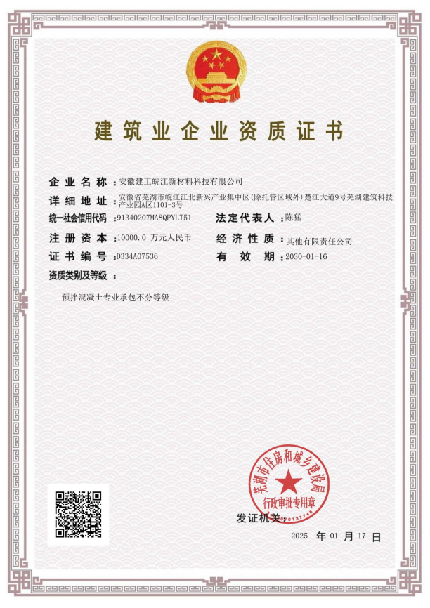 近日,安徽建工皖江新材料科技有限公司經蕪湖市住房和城鄉(xiāng)建設局正式批準,獲得預拌混凝土專業(yè)承包資質,標志著公司正式邁入建筑行業(yè)核心領域,為后續(xù)業(yè)務拓展奠定了基礎。