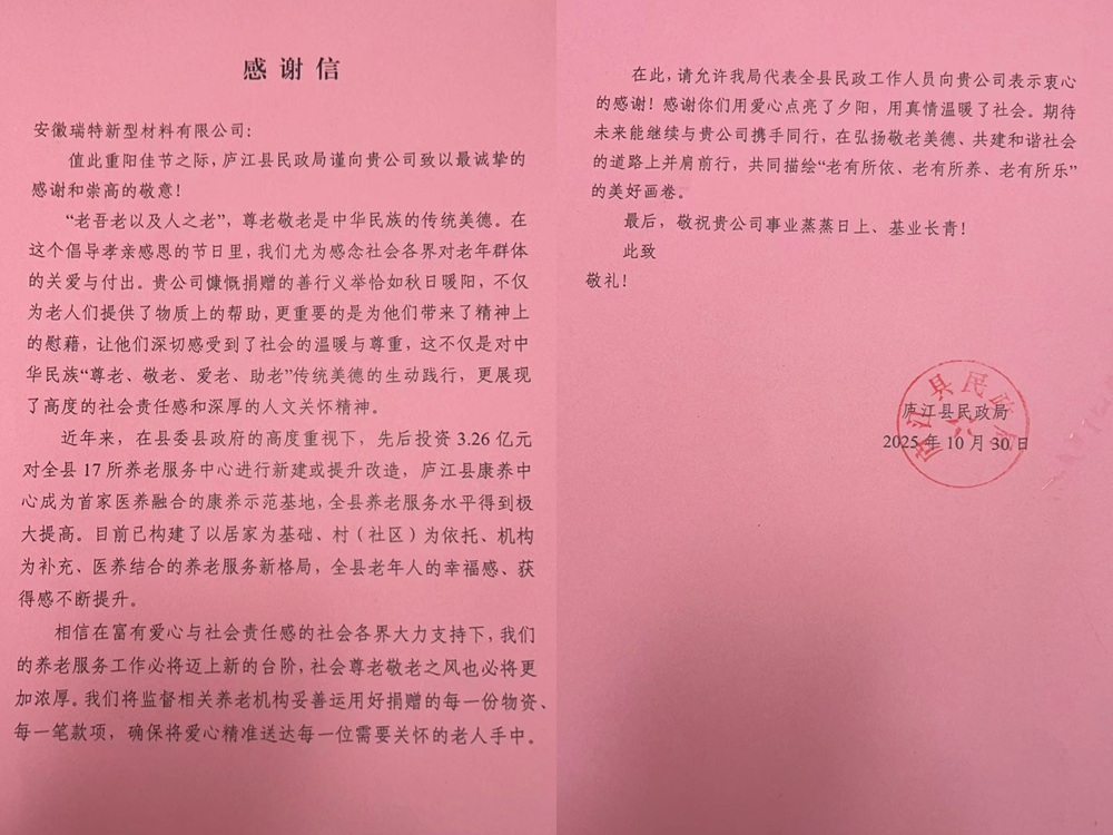 近日,安徽建工瑞特新材料科技有限公司收到來自廬江縣民政局的感謝信,對我司在重陽佳節期間開展的愛心敬老行動予以表彰和高度肯定。