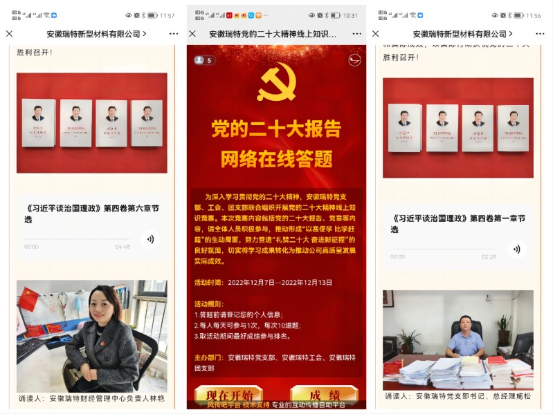 自黨的二十大會議召開以來,安徽瑞特黨支部迅速掀起學習熱潮,堅持系統謀劃,學用結合,廣泛組織各種學習宣貫活動,持續推動學習黨的二十大精神走深走實,讓黨的二十大精神入腦入心,切實將學習成果轉化為干事創業的生動實踐,助力安徽瑞特高質量轉型升級。
