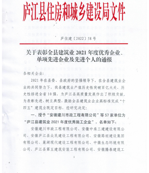 7月5日廬江縣住房和城鄉建設局公布廬住建【2022】58號文件《關于表彰全縣建筑業2021年度優秀企業、單項先進企業及先進個人的通報》。在表彰中授予“安徽瑞特新型材料有限公司”等9家單位為“廬江縣建筑業2021年度優秀預拌混凝土專業承包企業”。
