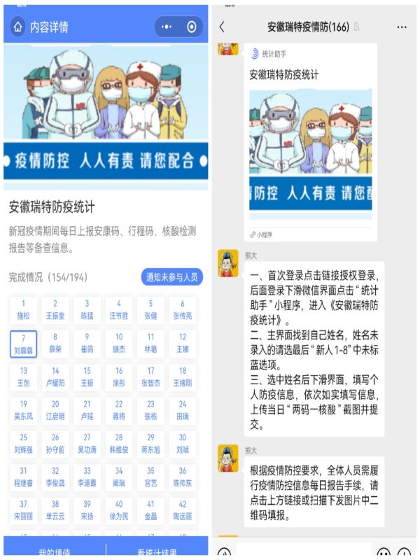 疫情就是命令,防控就是責任。安徽瑞特黨員干部和職工積極響應黨組織號召,主動報名參加廠區(qū)疫情防控24小時值班工作,輪流奮戰(zhàn)在防控疫情的最前沿,逐人逐車檢查“雙碼”。同時嚴格落實屬地“三天一次核酸檢測”防疫政策,以實際行動助力疫情防控工作。通過召開安徽瑞特疫情防控生產(chǎn)協(xié)調(diào)會,分析研判疫情對生產(chǎn)經(jīng)營的影響,逐項制定保供保產(chǎn)措施預案。為進一步加強防疫登記工作,探索“統(tǒng)計助手”微信小程序,實現(xiàn)全員線上填報員工每日健康信息,進一步筑牢疫情防控安全防線。